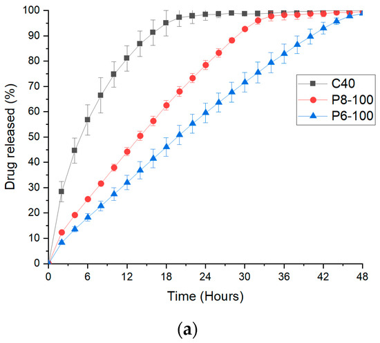 In vitro dissolution tests for P6-100 exhibited 100% release within 48 h, while P8-100, due to the larger aperture diameter (8 mm), achieved complete drug release in 32 h (Figure 9a). For comparison, the dissolution of only the core (C40) was evaluated and showed a first-order release profile reaching 90% drug release in ~16 h. The prolonged release of the cores was primarily due to the inclusion of PEO. PEO is a fast hydrating polymer, generating hydrogels able to control the drug release [76]. In particular, high molecular weight PEO swells to a greater extent and tends to form (when hydrated) stronger gels less liable to erode [77]. When the dissolution medium encounters the core, it will dissolve both sugar (mannitol) and water-soluble polymer (HPC), leaving empty spaces inside. Subsequently, the presence of empty spaces allows PEO to swell and create a viscous environment where the drug can be suspended and slowly diffuse out. To prevent drug sedimentation, the authors of [9] investigated a number of polymers in terms of their suspending properties. Results suggested that Hydroxy Ethylcellulose (HEC, Natrosol 250H) between 3 to 6% w/w was an optimal suspending agent. Therefore, HEC was included at 5% w/w in the core composition in the present work.