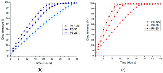 To widen the release profiles of the printlets, the cores were printed with two other infill percentages (50 and 25%) (Figure 9b,c). Visually, printlets with different infill percentages exhibited a similar visual appearance; however, dissolution profiles for P6-50 and P6-25 (Figure 9b) showed a reduction in the dissolution time proportionally with the reduced infill percentage (lowering the core infill percentage produced cores with larger void spaces). P6-50 and P6-25 exhibited complete drug release in 34 and 28 h, respectively. Changing the infill has been adopted in several studies [44,78] to modulate the drug release. The inclusion of empty spaces inside allowed the medium to access a higher surface area of the core within the same time reducing the dissolution time. Therefore, different infills can be used to personalize the release time. Additionally, increasing the infill produced cores proportionally larger in mass (Table 3), indicating that the infill represented another valid strategy to personalize the dosage form. As expected, printlets with larger apertures in the shell (8 mm) showed reduced dissolution times compared with 6 mm printlets (Figure 9c). Dissolution tests for P8-50 and P8-25 showed drug release in 20 and 16 h, respectively. A similar finding was obtained by the authors of [54], who showed how the aperture size in an FDM-printed shell can modulate the release of the drug of a conventional (crushed) tablet.