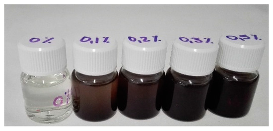 Photographs of the liquid phase of the acrylic bone cements’ (ABCs) formulations. From left to right, the percentage of graphene oxide (GO) increases from 0 to 0.5 wt.%.