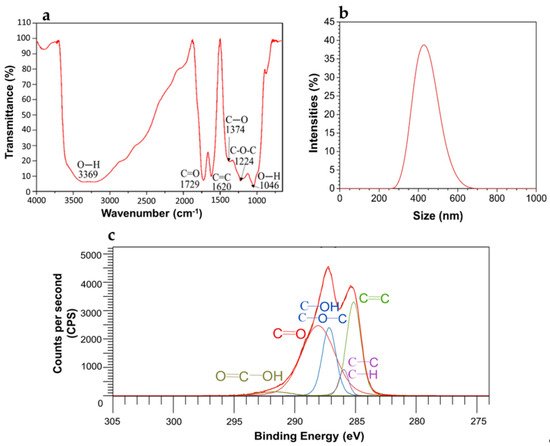 FTIR characterization of synthesized graphene oxide by the modified Hummers method [16] showed the characteristic bands of this material reported by other authors (Figure 2a). At 3369 and 1046 cm−1, the stretching vibrations of the hydroxyl functional group; at 1729 cm−1, the vibration of the carbonyl group (C=O); at 1620 cm−1, the vibration of the double bond C=C of the aromatic structure of GO; at 1374 cm−1, the vibration of the carboxyl group; and at 1224 cm−1, the characteristic peak of the epoxy group [20,22,23,24,25]. DLS results (Figure 2b) show an average particle size of 400 nm for GO sheets.