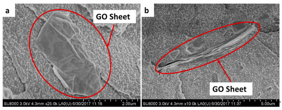 Scanning electron microscope (SEM) images of ABC with 0.5 wt.% GO, where the GO sheets are shown in the cement at different magnifications. (a) 25,000× and (b) 10,000×.