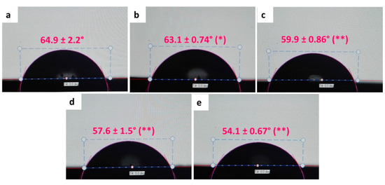 Photographs of water contact angle (WCA) on the surfaces of ABC with different percentages of GO. (a) ABC 0% GO, (b) ABC 0.1% GO, (c) ABC 0.2% GO, (d) ABC 0.3% GO, and (e) ABC 0.5% GO. Asterisks denote significant differences of ABC loading samples respect to ABC 0% GO at a significance levels of * p < 0.05 and ** p < 0.01.