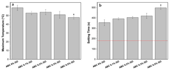 Handling parameters of liquid–powder mixture in ABC loadings with GO. (a) The maximum temperature reaches during the polymerization and (b) setting time of each formulation.The red dash line indicates the minimum value of the property set in ISO 5833-02 [21]. Asterisks denote significant differences of ABC loading samples with respect to ABC 0% GO at a significant level of * p < 0.05.