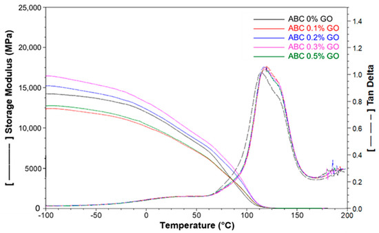 Figure 10 shows the results of the storage module (E’) and tan δ of the ABCs loaded with GO as a function of temperature. E’ increased with intermediate GO percentages (0.2 and 0.3%) and decreased with the lowest and highest GO percentages (0.1 and 0.5 wt.%). The previous result indicates that, possibly, the best dispersion of GO is achieved with the average rates of GO, which is corroborated with the mechanical properties to bending.