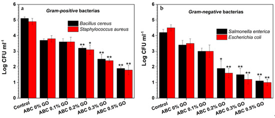 Colony-forming units (CFU) of Gram-positive (a) and Gram-negative strains (b) after 24 h incubation with GO-modified ABCs. Asterisks denote significant differences of ABC loading samples with respect to ABC 0% GO at significance levels of * p < 0.05 and ** p < 0.01.