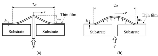 Dannenberg initially proposed using the blister test technique to characterize the interface adhesion strength [15]. In a blister test, a hole is bored or chemically etched in the rigid substrate until it reaches the thin film, and then a crack driving force is applied gradually through the hole until an axisymmetric blister crack extends into the interface of the thin film/substrate system. Then, the energy release rate can be determined by measuring the crack driving force, the radius and height of the blister. The blister test was developed into many different forms by subsequent researchers [16,17,18,19,20], in which two kinds of crack driving force are usually adopted, that is the shaft-loading as shown in Figure 1a and the gas or fluid pressure loading as shown in Figure 1b. In the shaft-loaded blister test, the radius of the loading-shaft is usually very small, which may lead to plastic yielding and piercing of the thin film. In the pressurized blister test, the catastrophic debonding will occur once the applied load exceeds the critical pressure [15], so a precise experimental setup is needed to simultaneously monitor the size of the blister and the applied pressure.