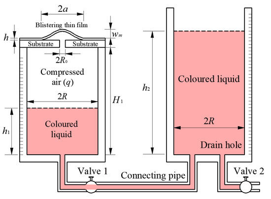 The experimental setup shown in Figure 2 still needs to make some improvement. In this experimental setup, the circular containers are designed with different inner radii, so that more pressure can be applied to the thin film. However, as it is known, in one and the same liquid, the same pressure is present at the same height. It is also valid for the pressure at the air and liquid interface. So, the relative pressure (relative to ambient pressure) of the compressed air q is only dependent on the density of the liquid ρ, the acceleration of gravity g, and the height difference of liquid in the two containers , and independent of the inner radius of the circular container [22]. So, it’s not necessary to design the two circular containers with different inner radii, and different inner radii will make the following derivation process of the energy release rate complicated. In addition, it is necessary that a valve is added to the connecting pipe, such that the influence of the fluctuation of liquid caused by pouring liquid into the right container during the experiment can be avoided by closing the valve. The experimental setup after being improved is shown in Figure 3, where R is the inner radius of the two circular containers.