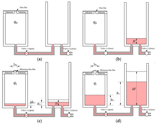 Figure 4. Schematic view of loading process or method of pressurized blister test: (a) Initial state; (b) Status before opening the valve 1 in step 1 of loading operation; (c) Stable state after step 1 of loading operation; (d) Stable state after step i of loading operation. - Close valve 1 and pour colored liquid with volume into the right container, as shown in Figure 4b. Since valve 1 is closed, the pressure of the enclosed air in the left container remains .