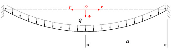 When determining the elastic strain energy Uef(a) stored in the blistering thin film, the exact analytical solution for the problem of axisymmetric deformation of the pressurized blistering thin film should be obtained first. This problem can be regarded as the well-known Hencky problem, as shown in Figure 5, whereby a transverse uniformly distributed loads q is applied onto the surface of a linearly elastic, initially flat, peripherally fixed circular membrane with radius a. The analytical solution used in Sun et al. [9] is exactly the well-known Hencky solution, where the above-mentioned assumptions (i)–(iii) are adopted. By giving up the so-called small-rotation-angle assumption (i.e., the assumption (i)), Sun et al. re-solved the well-known Hencky problem and obtained its power series solution [23], and solved the problem of axisymmetric deformation of prestressed Föppl-Hencky membrane under constrained deflecting [24]. Yang et al. [15] obtained the closed-form solution of the axisymmetric deformation problem of prestressed membrane also by giving up the so-called small-rotation-angle assumption. Recently, Sun et al. [25] presented a new closed-form solution of the well-known Hencky problem by simultaneously giving up the assumptions (i) and (ii), but the assumption (iii) is still where it is. So, it is necessary to take in account the effect of the deflection on the in-plane equilibrium equation, and give up the approximations used in the geometric equation.