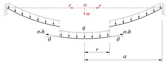 Now, let us take a rotationally symmetric isolated-body with radius r () from the central portion of the deformed membrane, with a view of studying its static equilibrium problem under the joint action of loads q and the membrane force acted on its boundary, as shown in Figure 6, where h is thickness, is radial stress, is the slope angle of the deflected membrane.