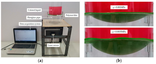 A polymer thin film with thickness 0.7 mm, Young’s modulus of elasticity 1.4 MPa, Poisson’s ratio 0.4 was clamped by two plexiglass pipes with inner radius 70 mm and wall thickness 5 mm, as shown in Figure 7a, where the non-contact laser displacement sensor was used to measure the deflection of the deflected thin film. After adding colored liquid (tap water mixed with a little red ink, the weight mix ratio is about 1000:1) into the upper plexiglass pipe, the polymer thin film was deformed and laterally deflected. The deflected polymer thin film, under different amounts of the colored liquid, is shown in Figure 7b, where q = 0.001 MPa and q = 0.0035 MPa denote the average loads applied onto the surface of the thin film (calculated by 1.570 kg and 5.495 kg, which are the weights of the added colored liquid), and the measured maximum deflections of the thin film are 18.66 mm (corresponding to 1.570 kg) and 29.17 mm (corresponding to 5.495 kg). The colored liquid of 1.570 kg is a cylinder with height 102 mm and radius 70 mm, and the colored liquid of and 5.495 kg is a cylinder with height 357 mm and radius 70 mm.