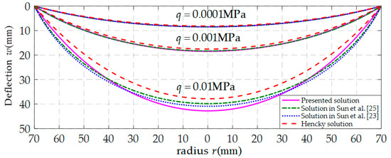 In order to investigate the influence of the above-mentioned assumptions (i)–(iii) on the analytic solution of the well-known Hencky problem, the calculation results of the deflection of the polymer thin film obtained by using four existing analytical solutions of the well-known Hencky problem are presented, as shown in Figure 9, where the dashed lines represent the results obtained by the well-known Hencky solution (i.e., the solution used in Sun et al. [9], in which assumptions (i)–(iii) were all adopted), the dotted lines by the solution presented in Sun et al. [23] (only assumption (i) was given up), the dash-dotted lines by the solution presented in Sun et al. [25] (assumptions (i) and (ii) were simultaneously given up), and the solid lines by the refined closed-form solution presented here (assumptions (i)–(iii) were all given up). From Figure 9, it can be seen that the dashed line, dotted line, and the dash-dotted line are very close to the solid line when q takes 0.0001 MPa, which also demonstrates the validity of the refined closed-form solution presented here. Moreover, when q takes 0.001 MPa, the dotted line and dash-dotted line are still very close to the solid line, but the difference between the dashed line and solid line emerges; and this difference becomes more and more obvious when q takes 0.01 MPa. It can also be seen from Figure 9 that, compared with the dashed line, the dotted line and dash-dotted line is closer to the solid line when q takes 0.01 MPa, which means that the accuracy of the analytical solution of the well-known Hencky problem can be improve by giving up assumptions (i) and (ii); but compared with the dotted line, the accuracy of the dash-dotted line is reduced. Therefore, in order to obtain a more refined analytical solution, the assumptions (i)–(iii) all need to be given up, such that the elastic strain energy Uef(a) stored in the film can be calculated accurately.