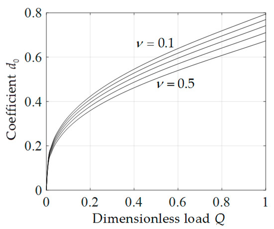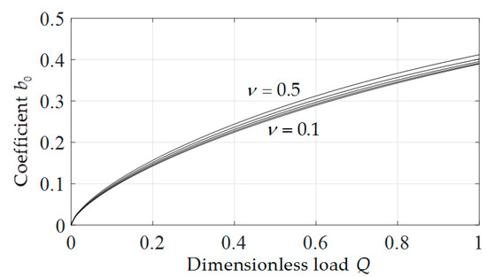 In addition, from Equations (32) and (34) it is found that, the coefficients and have important influence on the deflection and radial stress of the membrane at , respectively. So, and are two very important parameters which are determined by the boundary conditions. When determining the undetermined constants and , it is found that the values of and are only related to and Q. So, for the convenience of application, we presented the variations of and with Q when takes different values, as shown in Figure 10 and Figure 11. It can be seen from Figure 10 and Figure 11 that, and increase with the increase of Q, and under the same Q, decreases with the increase of v while increases with the increase of . In addition, it can also be seen that, compared with , is more sensitive to , i.e., the influence of Poisson’s ratio on the deflection of membrane is greater than that on the radial stress of membrane.