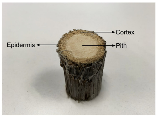 Cardoon (Cynara cardunculus L.) is native to the Mediterranean basin and belongs to Asteraceae Dumortier family. Its main components, cellulose and lignin, are present in varying amounts, depending on the part of the plant considered [13]. The aqueous extracts from its flowers have been used for centuries as coagulant in the traditional manufacture of ewes’ milk cheese making, due to high content of aspartic proteases and high milk-clotting activity. Cardoon extract confers particular texture and flavor to cheese products. Its use as coagulant in the production of some Portuguese and Spanish traditional ewes’ milk cheeses is required by specific regulations for cheeses that have protected designations of origin [14,15,16]. Even though this is its major current use, cardoon is a crop with a wide range of applications such as human nutrition (due to high amount of nutraceutical and bio-active compounds) [17] and medicine (compounds with anti-tumor, antibacterial and anti-HIV activity can be extracted from the plant) [18]. Cardoon can also be used for the production of lignocellulosic biomass and seed oil, for animal feed and as a raw material in paper pulp and plywood [11,19,20]. In Portugal, cardoon plants are cultivated mostly for the value of the flowers, used in the cheese industry. The stalks and branches are a by-product with no added value. The stalks (Figure 1) have a central pith surrounded by cortex and an irregular thin epidermis [13]. Cardoon stalks have remarkably low-density, which has been determined be several authors. Gominho et al. [21] obtained a density of 208 kg·m−3 for stalk particles with 20–30 mm. The authors further determined densities of 218 kg·m−3 for depithed stalks (longitudinally section of stalk without pith) and 75 kg·m−3 for the pith material. Quilhó et al. [22] determined a density of 138 kg·m−3 for whole stalks and 160 kg·m−3 for the depithed stalks. Gil et al. [23] reported a density of 114 kg·m−3 for milled stalks and branches.