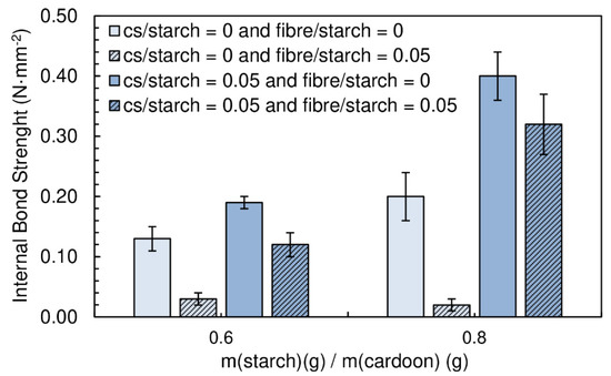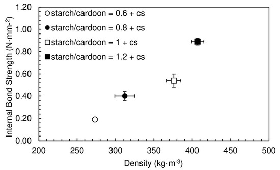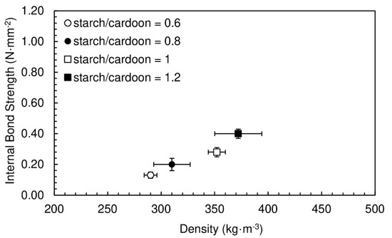 The particleboards produced had a moisture content between (19.0 ± 0.4)% and (19.1 ± 0.6)%. The internal bond strength and the final densities of the particleboards produced with the different starch/cardoon ratios are shown in Figure 2.