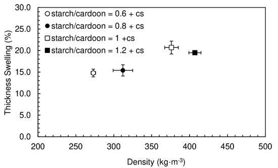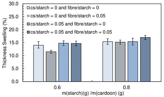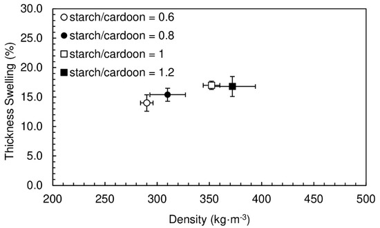 The thickness swelling results are shown in Figure 5. The thickness swelling values vary between 14.8% and 20.7%, being similar to the ones previously obtained with starch alone.
