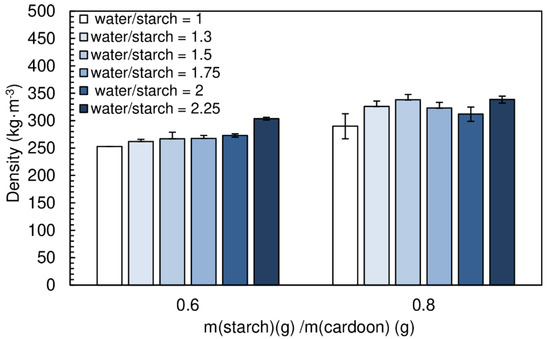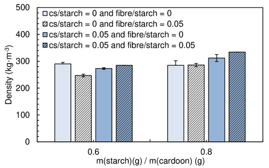 Starch/cardoon ratios of 0.6 and 0.8 were selected to the ensuing studies, since these yielded the lowest densities, with mechanical resistances around the target threshold of 0.30 N·mm−2.