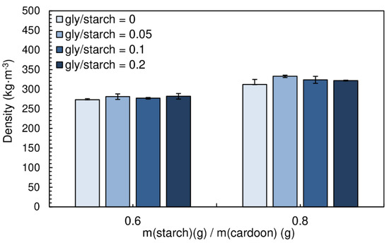 The density of the particleboards produced with different glycerol/starch ratios (0.05, 0.1 and 0.2) are shown in Figure 9. The densities vary between 273 and 282 kg·m−3 for starch/cardoon ratio of 0.6, while for panels produced with starch/cardoon ratio of 0.8 the densities vary between 312 and 333 kg·m−3.