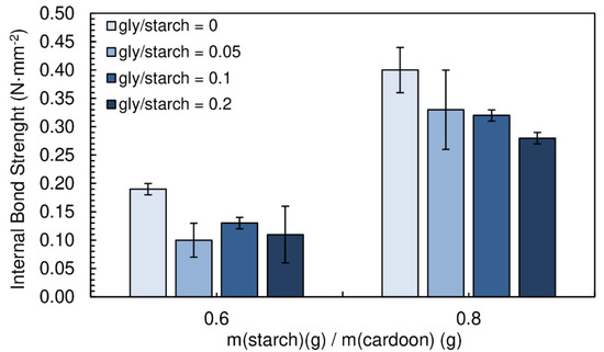 Figure 10 presents the influence of the addition of glycerol (gly) on the internal bond strength of the particleboards. A chitosan/starch ratio of 0.05 was maintained for all formulations. The particleboards produced had a moisture content between (16.9 ± 0.1)% and (19.8 ± 0.1)%.