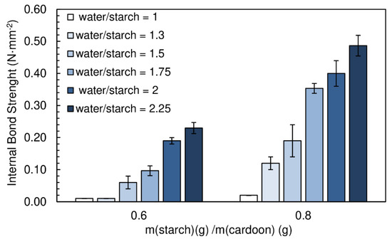 The amount of water proved to be an important component in the adhesive system. The internal bond strength of the cardoon panels improved with the increase of the water to starch ratio, probably due to more effective starch gelatinization, leading to better binder cohesion.