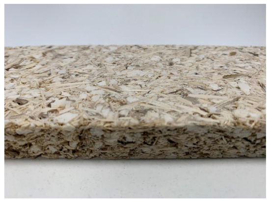 The particleboards produced with starch/cardoon ratio of 0.8 and water/starch ratio of 2.25 meet the proposed objectives, density ≤ 400 kg·m−3) and internal bond strength ≥ 0.30 N·mm−2. However, in order to minimize the drying time, the particleboards produced with a water/starch ratio of 1.75 satisfy the goal of this work. An example of a panel produced in these conditions is shown in Figure 14.