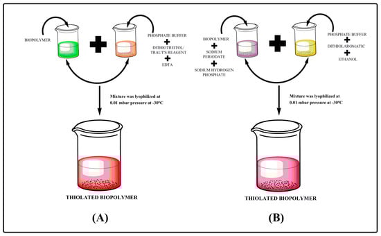 DTT is the trans isomer of compound 2,3-dihydroxy-1,4-dithiolbutane. It is able to reduce all biological sulfhydryl groups and to maintain free thiol groups despite the presence of oxygen. Biopolymer was dissolved in phosphate buffer pH 7.4. The quantity of DTT and EDTA depends upon the concentration and quantity of the biopolymer. The preparation was reacted at room temperature for 1 h, presented in Figure 2. An unreacted reagent was filtered and the sulfhydryl groups were checked by using Ellman’s reagent [58,60,61].