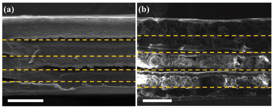 Cross-section view SEM images of the prepared composites including Ag layers such as (a) E-50 and (b) N-50. The yellow dashed lines indicate interfaces between the four Ag-deposited layers and the electrospun mat or the non-porous film. The multiple layers of N-50 were separated when they were cut for cross-sectional SEM imaging. The scale bars are 50 μm in both (a,b).