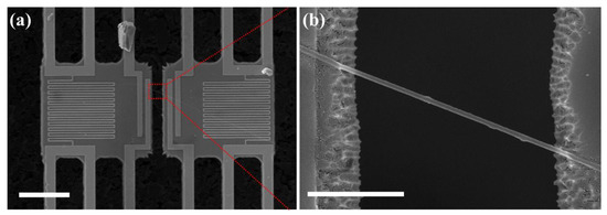 SEM images of the individual electrospun nylon 66 NF assembled on the suspended micro-device. (a) The central region of the suspended micro-device, where the suspended membranes and the NF are located. The scale bar is 20 μm. (b) Enlarged SEM image of the part of the NF that bridges the two suspended membranes. The scale bar indicates 2 μm.