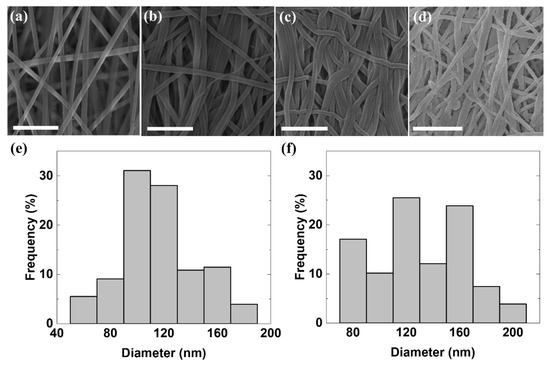 SEM images, which were taken in order of the fabrication process of E-50, of (a) As-spun NFs, (b) Ethanol-treated NFs, (c) An ethanol-treated and then hot-pressed mat, and (d) An Ag-deposited hot-pressed mat and corresponding diameter distributions of (e) As-spun NFs and (f) Ethanol-treated and hot-pressed mat. The ethanol treatment was applied to the as-spun mats before the hot-pressing process to increase adhesion between the NFs. All the scale bars indicate 1 μm. The average diameter and the diameter distribution were measured from five different SEM images of the mats using Image J software (National Institutes of Health, Bethesda, MD, USA). The average diameters of the as-spun and ethanol-treated and hot-pressed mats are 116.0 nm and 130.7 nm, respectively. It was thought that the average diameter of the NFs slightly increased during the fabrication processes.