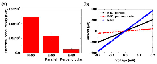 Electrical conductivity of the composites measured using the four-point probe method at room temperature. (a) Electrical conductivity values of a single 50-nm-thick Ag layer in N-50 and E-50. The electrical conductivity values of E-50 were obtained for two different directions, which are parallel and perpendicular to the nylon 66 NF alignment. (b) Corresponding I–V curves for the electrical conductivity measurements. The electrical conductivity of N-50 is significantly higher than those of the other samples because of the formation of well-connected electrical paths in the deposited Ag layer. As expected, there is no observed anisotropic characteristic depending on the direction for the electrical conductivity of N-50. On the other hand, the electrical conductivity of E-50 is relatively low because of the nanofibrous structure, and the conductivity in the parallel direction is higher than that in the perpendicular direction by a factor of 4.91.