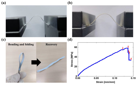To investigate the mechanical properties of the composites, bending and tensile tests were conducted for E-50 and N-50. Through bending tests of 3000 cycles, good mechanical performance including flexibility and attachment of the interfaces between the Ag and the nylon 66 layers was exhibited, as shown in Figure 6a,b. When E-50 was folded in half and released, it recovered to its original shape. Moreover, there occurred no structural damage, e.g., cracks, except for creases caused by the folding test, as shown in Figure 6c. However, the stress-strain curve of E-50 in Figure 6d shows that the multi-layered structures were fractured one-by-one during the tensile test. It was thought that the merged film may be resistant to bending forces, but disintegrates when subjected to tensile ones. The measured elastic modulus and maximum stress of E-50 are 1085 MPa and 58.5 MPa, respectively, at 0.1322 mm/mm. Compared to the values of nylon 66 nanofibrous mat obtained from a previous study [76], the elastic modulus and maximum stress were enhanced by factors of 23.4 and 12.9, respectively. This is due to the hydrogen bond rupture and subsequent movement of molecular chains, which could increase the crystallinity during the hot-pressing process [47].