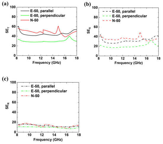 Figure 7 shows the measured SET, SER, and SEA values of E-50 and N-50 in the X- and Ku-bands. The SE values of E-50 were obtained for two different cases: the first one in which the electric fields of the EM waves were parallel and the second one in which they were perpendicular, to the orientation of NFs. The SE of E-50 became higher when the EM waves were parallel with the axial orientation of the NF. This phenomenon was also observed for metallic wire grids, of which the geometries were comparable to the wavelength of the incident EM waves when the direction of the grid was parallel to the polarization of the EM waves [77,78]. Additionally, all the SET values satisfied the commercial requirement of 30 dB, as shown in Figure 7a [79,80,81]. In particular, due to the porous structure, the SET of E-50 with a thickness of 100 μm was as high as 60.6 dB in addition to its high thermal conductivity and low density of 0.893 g/cm3. Generally, the EMI SE, SSE, and absolute SE (SSE/t, obtained by dividing SSE to its thickness) are useful criteria for comparing EMI shielding performance because there is a demand for lightweight and thin EMI-shielding materials. The calculated SSE and SSE/t values of E-50 are 67.92 dB cm3/g and 6792 dB cm2/g, respectively. Despite the thinness of the prepared EMI shielding composite, the SE value of E-50 is higher than or comparable to the reported values listed in Table 2. Considering the low filler content and the high thermal conductivity, it was certain that the SSE and SSE/t values of E-50 are also sufficiently outstanding. In this nanofibrous and multi-layered structure, there may exist two additional shielding mechanisms that contribute to absorption: inter-fiber [32] and inter-layer [82] multiple reflections. The inter-fiber multiple reflections mostly occur inside each of the four Ag layers on the nanofibrous mats. Because of the large effective surface areas of NFs, incident EM waves are reflected multiple times from the metal surfaces, possibly resulting in absorption of the EM waves and corresponding heat dissipation. In contrast, the inter-layer multiple reflections arise among the spatially separated Ag layers. As shown in Figure 7b, the SEA value of E-50 is slightly lower than that of N-50 below 15 GHz but can be considered comparable to that of N-50 over the entire range of the X- and Ku-bands. Although the electrical conductivity of N-50 is much higher than that of E-50, the contribution of its high electrical conductivity to SEA was insignificant, as shown in Figure S4 (in the Supplementary Materials). The ratios of SEA to SET, obtained from the electrical conductivity of E-50 and N-50, were not different from each other despite the large difference in their electrical conductivities. The inter-fiber multiple reflections among the NFs would not play a dominant role for the EMI shielding of E-50 considering that the electrospun NFs were well aligned and that a large amount of the empty space between the NFs disappeared when the NFs were hot-pressed as shown in Figure S7 (in the Supplementary Materials).