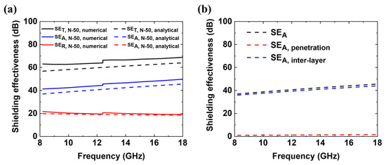 Numerically (continuous line) and analytically (dashed line) calculated shielding effectiveness of N-50 at the X- and Ku-bands. (a) Numerically and analytically calculated SET (black), SEA (blue), and SER (red) of N-50 agree well with each other. (b) Analytically calculated total SEA (black), which is composed of the multiple inter-layer reflections (blue) and the penetration loss (red), at the X- and Ku-bands. Most of the total absorption is due to the inter-layer multiple reflections mechanism.