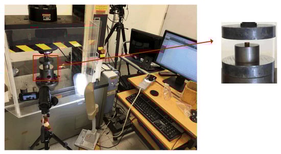 As shown in Figure 3, the split Hopkinson pressure bar (SHPB) testing system is widely used for investigating the dynamic compressive response of the materials []. The SHPB equipment mainly consisted of a gas gun, striker bar, incident bar, and transmission bar. In this study, the bars are made of titanium alloy with Young’s modulus E = 110 GPa and density ρ = 4.4 g/cm3. The lengths of the striker bar, incident bar, and transmission bar are 500 mm, 1800 mm, and 1200 mm, respectively. The diameter of all the bars is 16 mm. During the impact test, when the striker bar hits the incident bar, an elastic compressive wave is generated in the incident bar. The speed of the elastic wave is 5000 m/s (). The high-speed camera begins operating upon the input signal and is detected by the strain gauges and the oscilloscope. When the incident wave reaches the end of the incident bar, part of the elastic wave reflects back, and the rest transmits through the composite into the transmission bar. In order to improve the accuracy of the SHPB test, a small amount of Vaseline was applied on the surface of the specimen, which could reduce the friction between the specimen and bars. The brass sheet was used as a pulse shaper for getting a constant strain rate when the specimen was subjected to dynamic compressive loadings. The engineering strain (), engineering stress (), and strain rate () of the specimen are calculated by []: