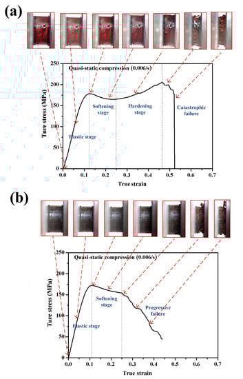 Typical true compressive stress–strain curves and the progressive failure processes of neat benzoxazine and ABP that were tested under a quasistatic loading condition are depicted in Figure 4a,b, respectively. From Figure 4a, neat benzoxazine went through an elastic stage, softening stage, hardening stage, and final catastrophic failure. The compressive behavior of the benzoxazine matrix is very similar to some conventional thermosetting resins such as epoxy and solid polyurethane [,]. Meanwhile, from the real-time images, the neat benzoxazine was simply flattened without any obvious sign of damage before the sudden failure occurred. From Figure 4b, alkali-treated bamboo fiber/polybenzoxazine composite exhibited different compressive behaviors. In comparison with neat benzoxazine, there was no enhancement in Young’s modulus and in the yield strength of the composite. ABP also had similar elastic and softening stages. However, for ABP these stages were followed by a progressive failure stage rather than the hardening stage of the pure matrix. These results indicate that chopped bamboo fibers could not enhance the quasistatic compressive strength of the composite, which is consistent with some similar studies [,,]. Falliano et al. [] studied the mechanical properties of polymer fiber reinforced foamed concrete material and found that the short fibers could increase the flexural strength of the material while these fibers exhibited a slight effect on the compressive properties of the concrete material. Qin et al. [] investigated the quasistatic compressive behaviors of polypropylene fiber reinforced concrete material, and the results showed that the short fibers could change the failure modes of the material while these fibers could only increase the compressive strength of the material by 6.15%. This may be due to the direction of bamboo fiber distribution in the matrix. When the composite was subjected to compressive loading, the chopped bamboo fibers could not bear the load effectively. The high tensile strength of the bamboo fibers was only utilized indirectly due to the Poisson effect. The compressive strength and modulus of the composite were still controlled by the benzoxazine matrix. Another possible reason for the negative effect of adding bamboo fibers was that some bubbles, voids, and other potential defects could be introduced to the composite during the preparation process, leading to the stress concentration when the specimen was subjected to compressive loading. In other words, the potential defects caused the disappearance of the hardening stage of ABP. However, during the progressive failure stage of the composite, we could hear continuous sounds of the matrix cracking and bamboo fiber breakage. This was due to the existence of bamboo fibers, which could hinder high-speed crack propagation in the matrix [].