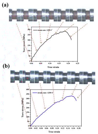 In the above equations, , , and refer to the cross-sectional area, stress wave speed, and Young’s modulus of the incident bar, respectively. and denote the length and cross-sectional area of the specimen, respectively; is the tensile strain of the incident bar; and is the compressive strain history of the transmitted bar tested by the applied strain gauges and oscilloscope. To ensure the reliability of the experiment, two repeated experimental results of the same specimens were obtained at least. The true stress and strain of the specimen can be calculated by the following equations: