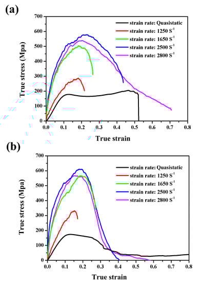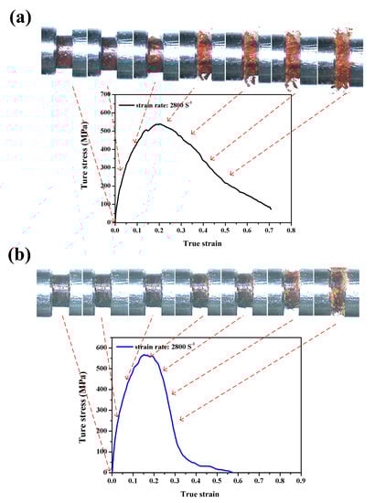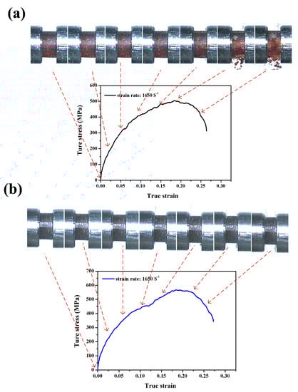 Figure 8a,b shows the dynamic compressive stress–strain curves of neat benzoxazine and ABP at a strain rate of 1650/s, respectively. The maximum compressive stress of neat benzoxazine was 504 MPa, which was 75.6% higher than that under a strain rate of 1250/s. Remarkable positive strain rate dependence was observed in benzoxazine resin. With the increase of strain rate, the neat benzoxazine and ABP displayed obvious, more nonlinear behaviors at the initial stage of the stress–strain curves. The Young’s modulus of the specimen was not given in this study because it was widely accepted that the Young’s modulus of materials measured by SHPB was not accurate [].