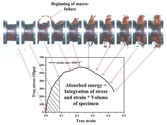 To quantify the crashworthiness of neat benzoxazine and ABP, the energy absorption at different strain rates was calculated. When macro failure can be observed, the specimens are no longer safe for use. Therefore, as shown in Figure 12, the energy absorption defined in this study was calculated by integrating the true stress–strain curves from the strain equal to zero to the strain where initial visible macro failure occurred, and multiplying the volume of the specimen. The results are presented in Figure 13 and Table 2. At strain rates of 1650/s, 2500/s, and 2800/s, the energy absorptions of the composite were 90.7%, 105.7%, and 184.8% higher than that of neat benzoxazine, respectively. Similarly, Hou et al. [] studied the dynamic compressive behaviors of steel fiber reinforced reactive powder concrete, and the results showed that the chopped steel fibers could significantly increase the impact toughness of the concrete under impact loadings. It could be concluded that the short bamboo fibers could significantly enhance the impact toughness of the composite, which is very advantageous for using this kind of composite material in impact safety applications.