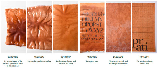 The mixture used for the production of the film included commercial corn starch for alimentary use, glycerol of 99.5% purity (E422), citric acid from lemon juice and isinglass to ease bonding, in the respective proportions 9:3:1:0.7. Moreover, 0.15 parts of mono- and diglycerides of fatty acids (E471) were added to prevent the formation of mold and to ease the manufacturing of a flat film of material during laying up. In this way, a thermoplastic starch (TPS) has been obtained. Smoketree-tanned leather in irregular fragments having their largest dimension between 10 and 500 microns approximately, was added to the material in the proportions of 7.5, 15 and 22.5 wt% over the dry weight of the mixture. The three composites obtained were defined ex-post as TPS_ leather 1/2, TPS_leather 1 and TPS_leather 3/2, considering 1 as the ideal proportion for the production of the final material, which requires some deformation to be retained in the flat sheet obtained. These proportions were set after a large number of experiments carried out starting from October 2015 in the Course of “Sperimentazione di Materiali Innovativi per il Design” (Experimentation on Innovative Materials for Design) in University of Camerino and completed during 2018 with the experimental aims that are illustrated in Figure 1: the last image of Figure 1 shows the material developed, which is here reported as “TPS_Leather 1”, further developed in sheets with dimensions 300 × 200 mm. The contents of the different raw materials in percentage over dry weight of the film are reported in Table 1. The three composites are compared between them, and to the pure TPS developed with the aforementioned proportions.
