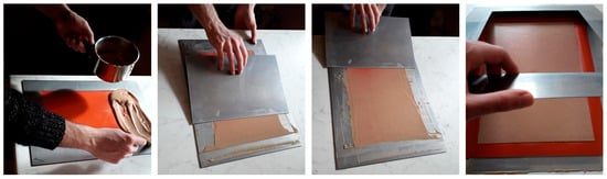 Film production was obtained by adding the mixture with some amount of water to allow obtaining a sufficient fluidity, then heating it at a temperature not exceeding 80 °C, reached by its continuous mixing in an uncovered container in 10 min. The mixture was then cast on a silicon plate, 1 mm thick, with the assistance of a steel lamina, again 1 mm thick, to level it inside a steel frame with a thickness of 1.5 mm. The frame is removed just after the cast process and the film is left cooling naturally on the silicon sheet. The phases of the production process are reported in Figure 2.