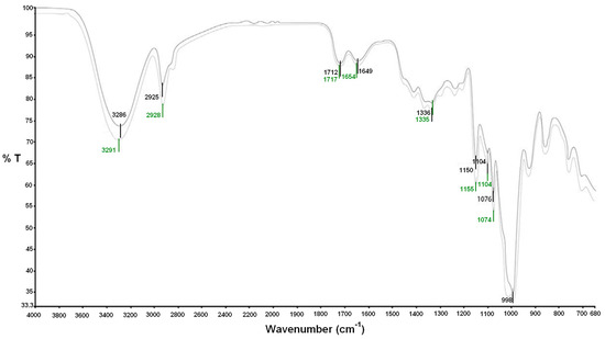 FTIR spectra carried out on the material newly produced (darker curve) and then subjected to UV ageing (lighter curve).