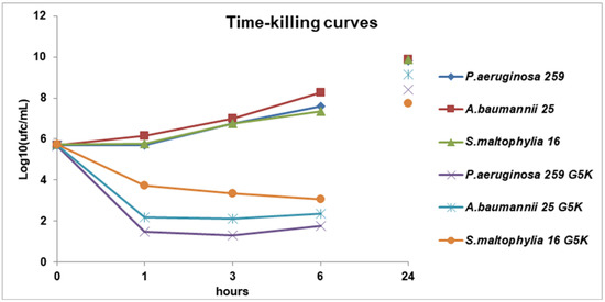 Time-killing curves performed with G5K (at concentrations equal to 4 × MIC) on P. aeruginosa 259, S. maltophilia 16, and A. baumannii 25.