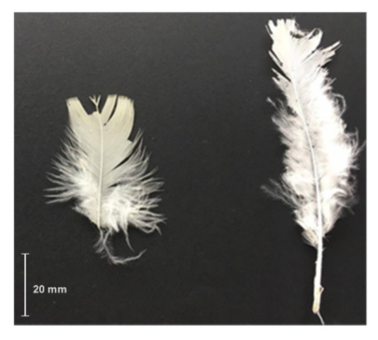 - Reddy, N.; Yang, Y. Structure and properties of chicken feather barbs as natural protein fibers. J. Polym. Environ. 2007, 15, 81–87. [Google Scholar] [CrossRef]