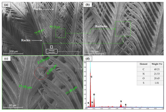 Additionally, to chemically characterize these BPFs, this study also implemented energy dispersive X-ray spectroscopy (EDS) in the selected barb area shown in Figure 4a, whose results are presented in Figure 4d. The resulting weight composition showed the following chemical elements: C (48.21%), O (28.45%), N (21.53%), and S (1.81%). This is consistent with previous studies (e.g., [40]). The latter chemical composition can be related to the principal functional groups present in the biopolymer keratin, which is the main component of these BPFs. Lastly, the chemical elements carbon and oxygen can be related to the functional carboxylic acid groups (–COOH), the presence of nitrogen can be related to the amino groups (–NH2), and the sulfur can be related to the presence of disulfide groups (–S–S) [16,26].
