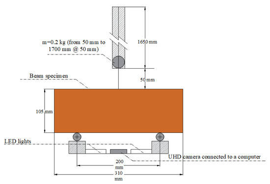 As mentioned by previous studies (e.g., [58,59,60,61]), the fracture toughness of composite materials, including earthen mixes, can be modified due to fiber-reinforcement and the impact strength test has been suggested as a way of measuring this damage-absorption capacity. This research implemented a setup consisting of beam specimens supported at two points by a metallic base (20 cm distance between supports) and a metallic projectile was thrown at the midspan of the beam specimens at increasing heights (see Figure 6). It is worth mentioning that two LED lights, as well as an ultra-high-definition (UHD) camera (with a protective case) connected to a computer, were placed at the bottom of the specimens to assist with the evaluation of the damage progress (especially with the identification of the generation of the first crack of each beam specimen), as shown in Figure 6. In the cases where beam specimens resisted the maximum drop height of the metallic projectile, subsequent drops were executed at the maximum height until collapse of the specimens was reached. Considering the mas of the metallic projectile (0.2 kg), the gravitational acceleration constant (9.81 m/s2) and the varying height from which the projectile was thrown (from 50 to 1700 mm, in 50 mm increments), the impact energy applied per blow ranged from 0.098 to 3.332 J for drop heights of 50 to 1700 mm, respectively.