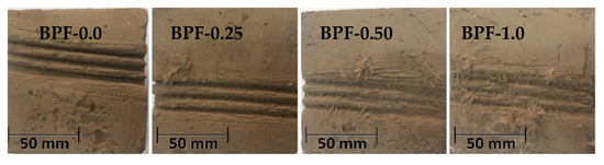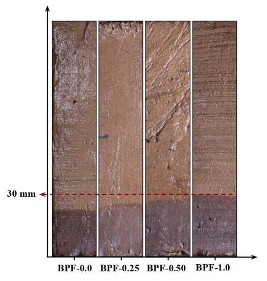 Figure 7 presents the capillary water rise of each earthen mix measured at Day 1, and it can be seen that the capillary water rise monotonically increased as the BPF doses increased (e.g., at Day 1, the average values of the capillary water rise were 20, 25, 28, and 30 mm for earthen mixes BPF-0.0, BPF-0.25, BPF-0.50, and BPF-1.0, respectively).