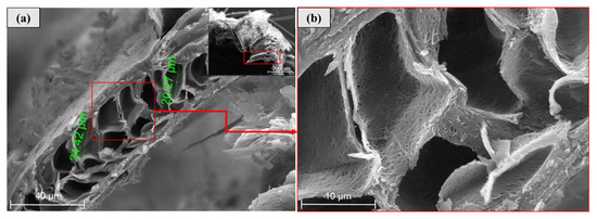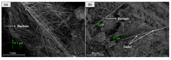Moreover, Figure 10a,b shows the cross section of a barb, which has a hollow, honeycomb-shaped inner structure with dimensions ranging from 20.27 to 24.42 µm, similar to what was obtained by Reddy et al. [41]. As mentioned before, this inner structure facilitates a capillary water increase in fiber-reinforced earthen mixes.