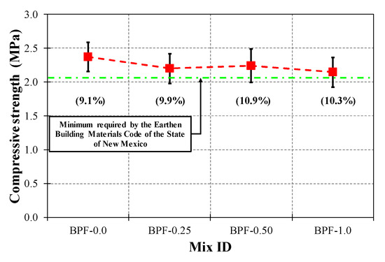 As can be seen in Figure 12, the values of AV (as squares), SD (as error bars above and below each average value), and COV (in parentheses below each average value) of the compressive strength ranged from 2.14 MPa (BPF-1.0) to 2.37 MPa (BPF-0.0), from 0.22 MPa (BPF-0.0) to 0.25 MPa (BPF-0.50), and from 9.1% (BPF-0.0) to 10.9% (BPF-0.50), respectively. It is important to note that all earthen mixes in this study exhibited average compressive strengths greater than 2.07 MPa, which is the minimum compressive strength required by the Earthen Building Materials Code of the State of New Mexico [68]. In terms of trends, there was some reduction in the average compressive strength as the BPF doses were increased. However, the latter average compressive strength reduction was not statistically significant, as confirmed by the ANOVA test summarized in Table 6, including a large p-value of 0.11, which is consistent with previous works addressing the compressive strengths of earthen mixes incorporating small doses of polypropylene micro fibers [48,59].