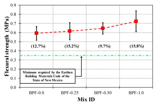 In terms of the flexural performance, Figure 13 shows that the AV, SD, and COV values of flexural strength ranged from 0.59 MPa (BPF-0.0) to 0.72 MPa (BPF-1.0), from 0.06 MPa (BPF0.50) to 0.11 MPa (BPF-1.0), and from 9.7% (BPF-0.50) to 15.8% (BPF-1.0), respectively. It is worth noting that all earthen mixes in this study exhibited average flexural strengths greater than the minimum value of 0.35 MPa required by The Earthen Building Materials Code of the State of New Mexico [68]. In terms of trends, there was a monotonic increment in the flexural strength as the dose of BPFs increased. Nevertheless, similar to what was observed with compressive strengths, the latter monotonic flexural strength increment was not statistically significant, as confirmed by the ANOVA test summarized in Table 7. The latter is also consistent with previous works addressing the flexural strengths of earthen mixes incorporating small doses of polypropylene micro fibers [48,59], where these micro fibers, when well mixed and in reduced doses, did not significantly affect the mechanical strength properties.