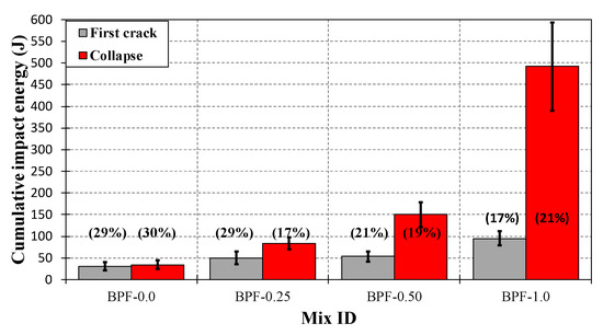 Since the drops needed to generate the first crack and the collapse of each beam specimen were counted, then, the accumulated impact energy AV, SD, and COV values were estimated at 28 days after casting.